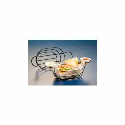 Oblong wire baskets with ramekin holders, You’ll love the convenience of built-in ramekin holders on these baskets! 2 oz. ramekins are sold separately. Looks great with or without ramekins. Chrome 6″ x 9″ x 3-7/8″ H (15.2 x 22.9 x 9.8 cm)