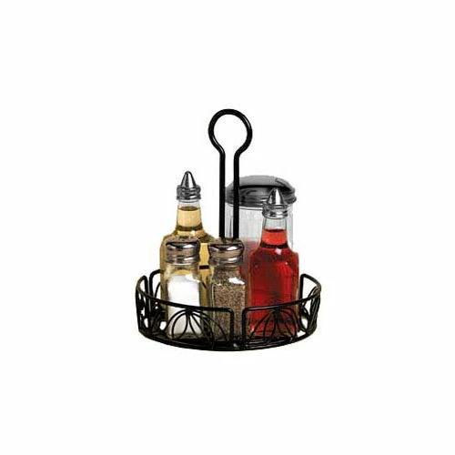 Wrought iron condiment racks w/leaf design. Black wrought iron detailed with a leaf pattern looks great on tables everywhere. A slot in the center handle holds table numbers or cards. 7-1/2″ Dia. x 9″ H (19.1 x 22.9 cm)