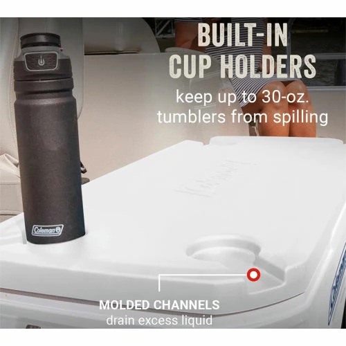• Keeps the Ice™ up to 5 days with fully insulated lid and body in temperatures as high as 90°F • Heavy-duty 6-inch wheels and durable tow & swing-up handles designed for easy transport • Cup holders with drain are molded into the lid to keep drinks from spilling and fit up to a 30-oz. tumbler • Have-A-Seat™ lid supports up to 250 lbs. • Stain-resistant liner for easy cleanup • Recessed lip for easier access to contents • Holds up to 160 cans • Leakproof channel drain plug.